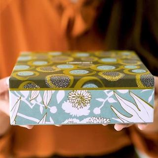 Il rivestimento può essere personalizzato con carte pregiate, stampe raffinate e finiture di lusso, trasformando la scatola in un vero e proprio oggetto da conservare e riutilizzare.
